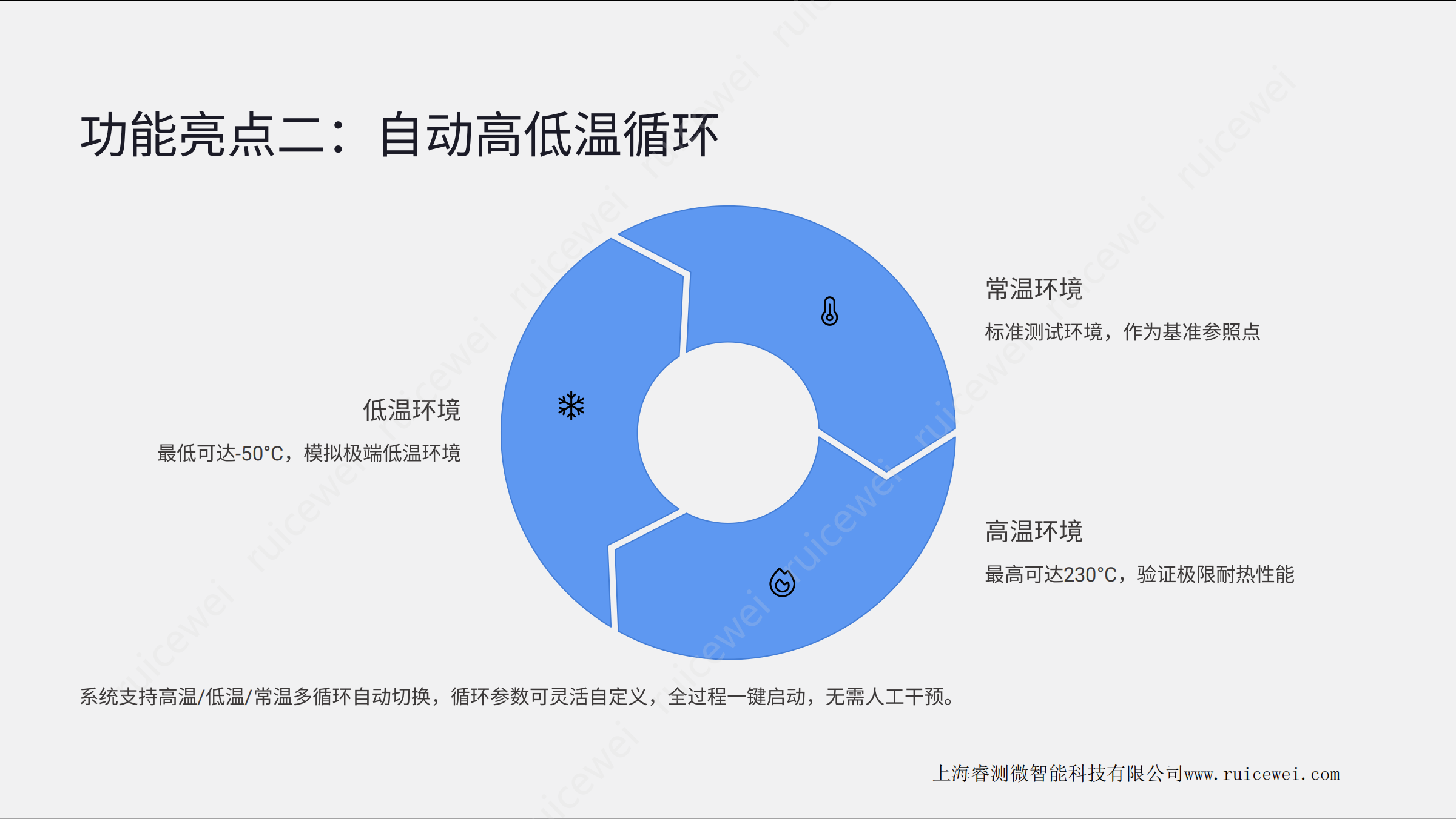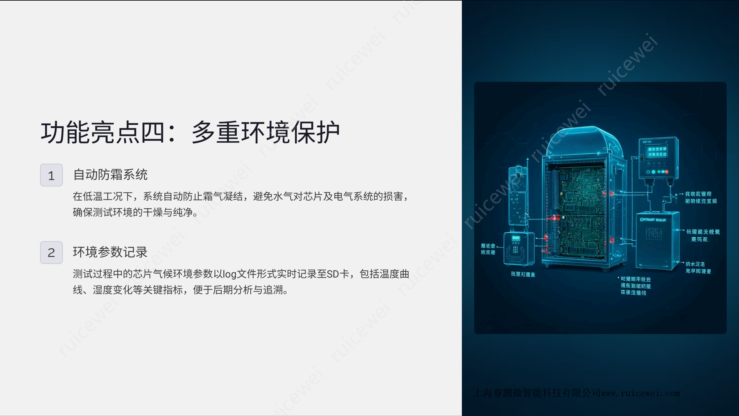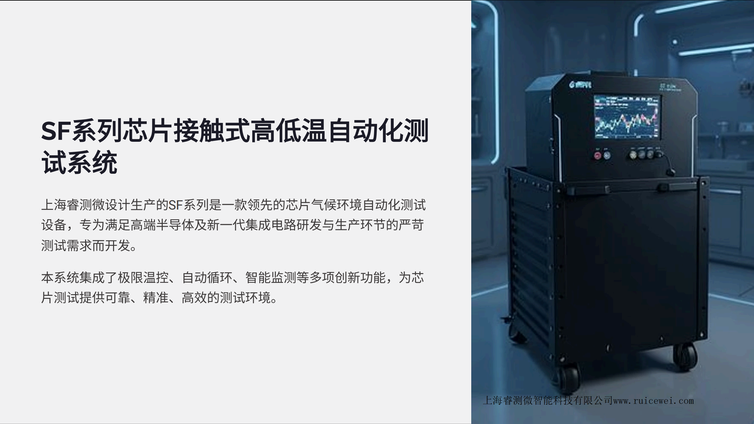 SF系列是一款领先的芯片气候环境自动化测试 设备 ,专为满足高端半导体及新一代集成电路研发与生产环节的严苛 测试需求而开发。本系统集成了极限温控、 自动循环、智能监测等多项创新功能 ,为芯 片测试提供可靠、精准、 高效的测试环境。